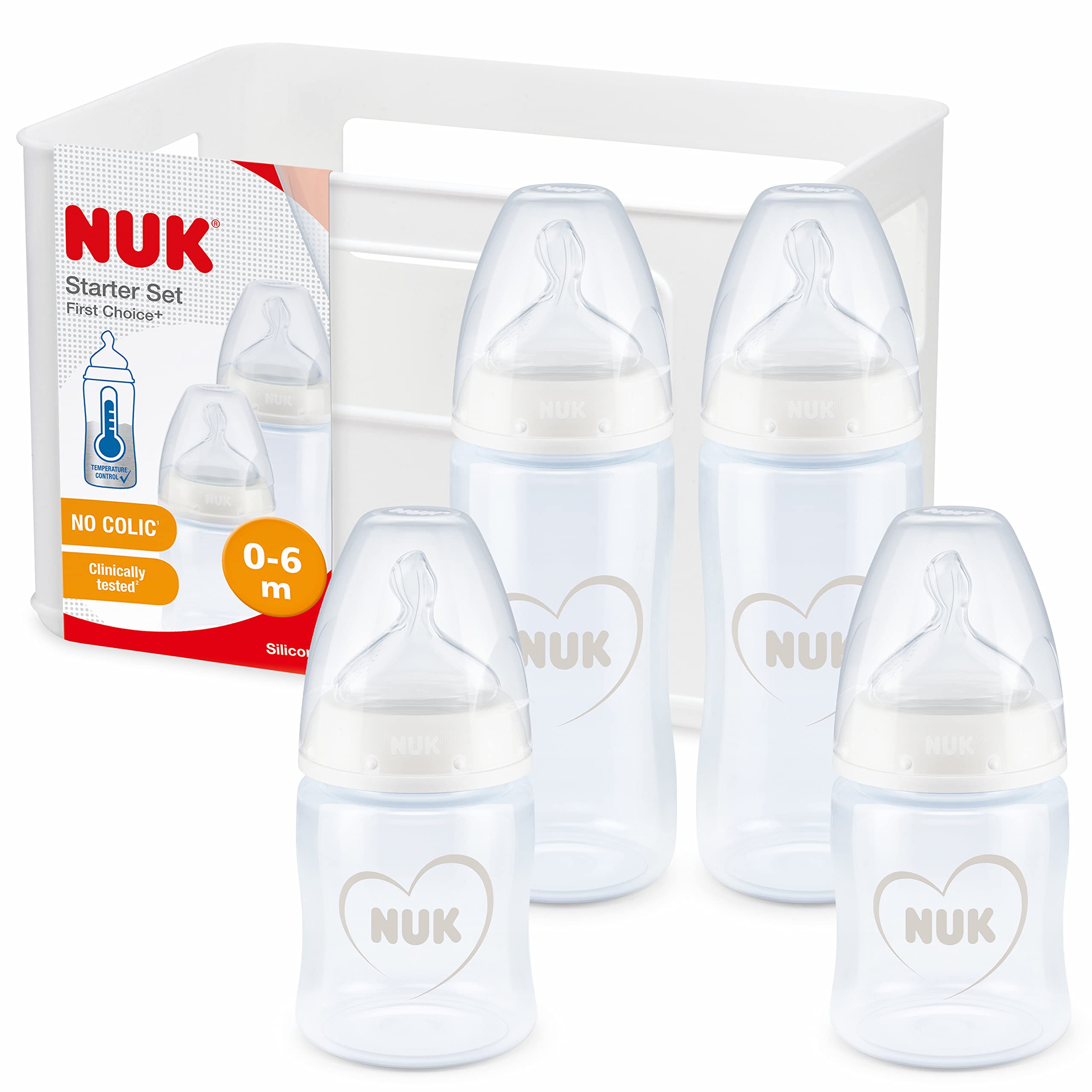 Conjunto de Biberões NUK First Choice+ | 4 biberões anticólicos + 1 cesta | 0-6 meses