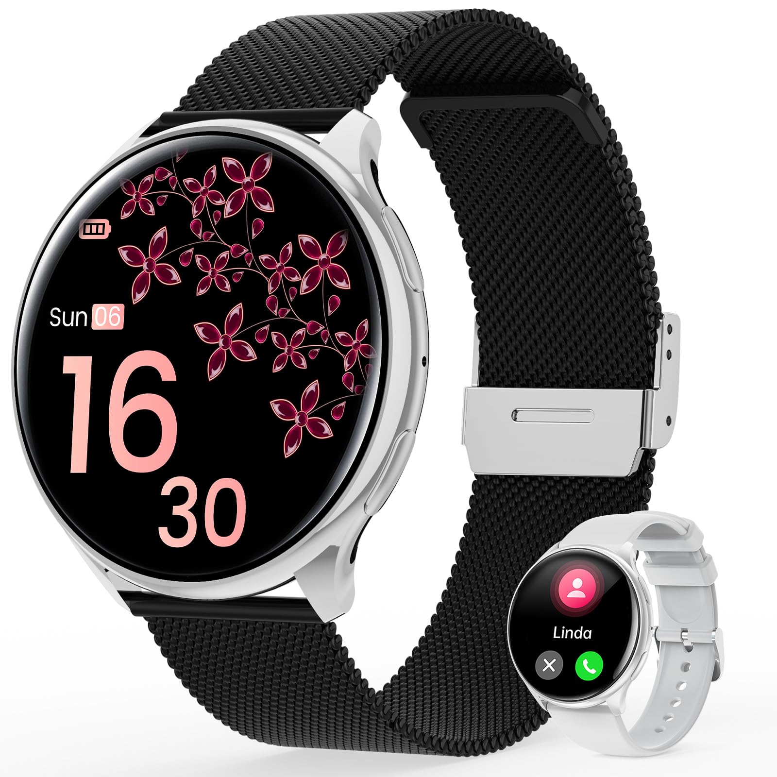 Relógio Inteligente para Mulher com Chamadas Bluetooth – Resistente à Água – iOS/Android – Preto/Prateado