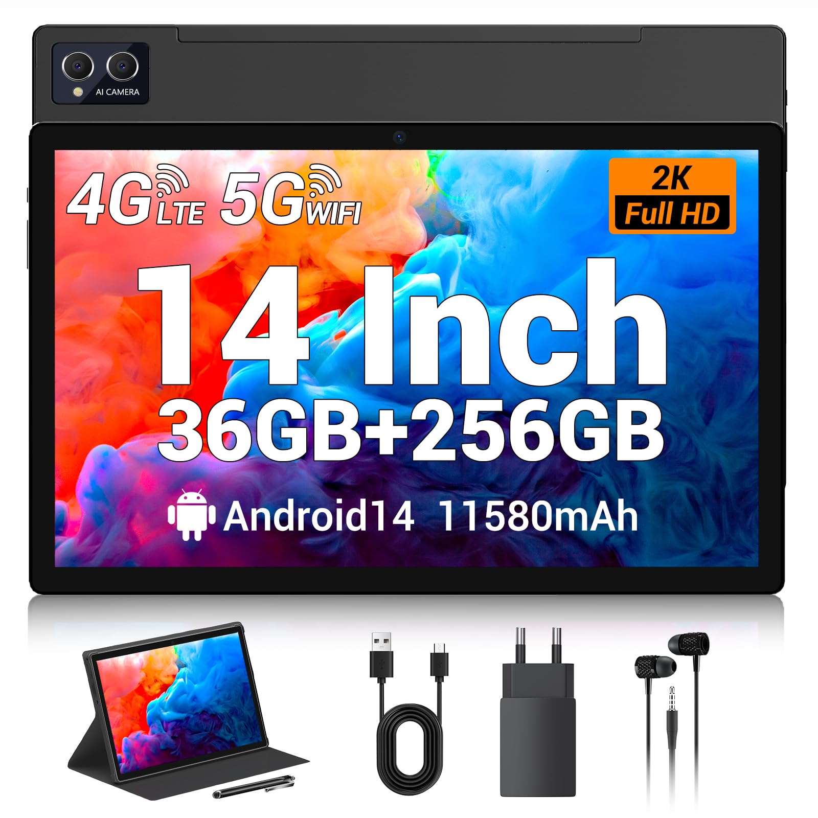 Tablet 14″ Android, 36GB RAM, 256GB ROM, 4G LTE + 5G WiFi, Octa Core 2.0GHz, Câmera 8MP + 13MP, GPS, Bateria 11580mAh
